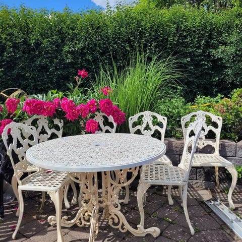 Gjutjärn Trädgårdsmöbler bänk och två stolar vit metall