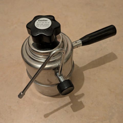 Korvspruta fabrikat Tre Spade, för upp till tre kg korvsmet. Lättarbetat även med emulsionskorv. Fyra korvhorn med diameter ca 14, 22, 28 och 38 mm.