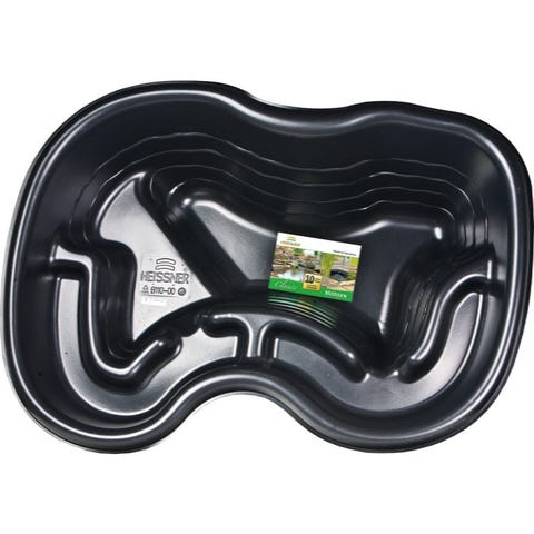 Trädgårdsdamm gjord av svart hårdplast. Diameter ca 230cm. Djup ca 60cm (center).