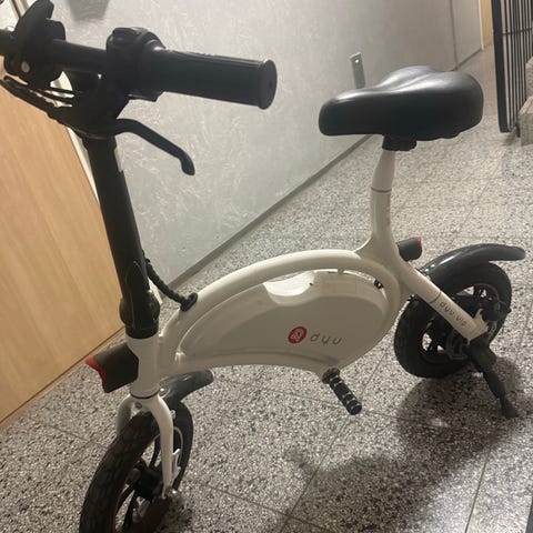 Elcykel av okänt märke, kompakt modell med små hjul och låg ram. Färgsättning i svart med röda och vita detaljer. Utrustad med sadel, styre med handbroms och reglage, samt inbyggt batteri i ramen. Passar för kortare transporter och pendling i stadsmiljö. Hopfällbar konstruktion som underlättar förvaring och transport.