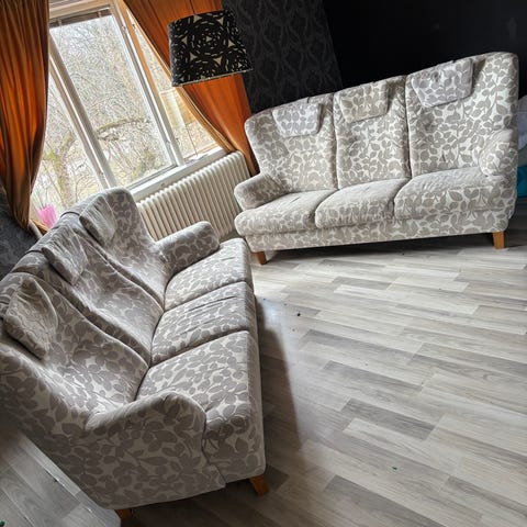 1 3-sits soffa och 1 2-sits soffa i ljusgrått tyg. I bra skick men några mindre fläckar.