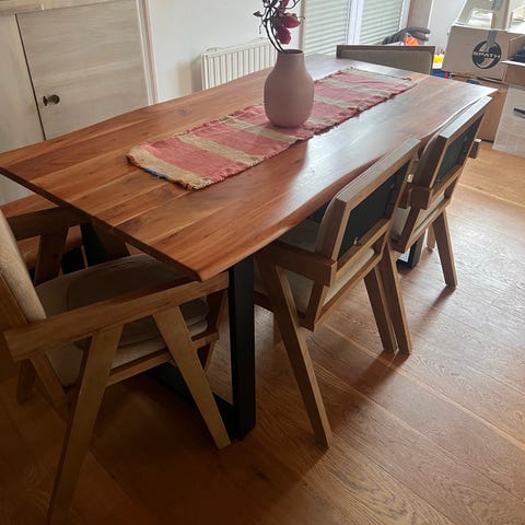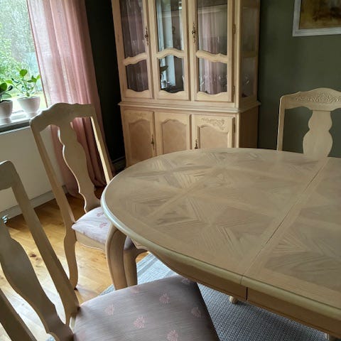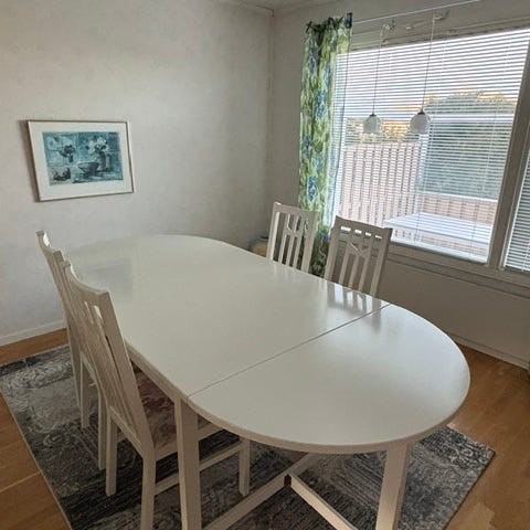 4 stolar och ett bord med 2 iläggsskivor.