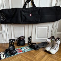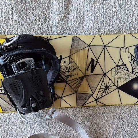 K2 snowboard med bindningar. Brädan har en överdel i svart med flerfärgat mönster och turkosa detaljer samt en undersida i vitt med ljusa mönster och turkosa inslag. Bindningarna är turkosa med svarta detaljer och är monterade på brädan. Passar för snowboardåkning i pist och park. Längden på brädan är 140 cm. Bindningarna är använda med storlek 37/38 i boots men går för både större och mindre fötter än så.