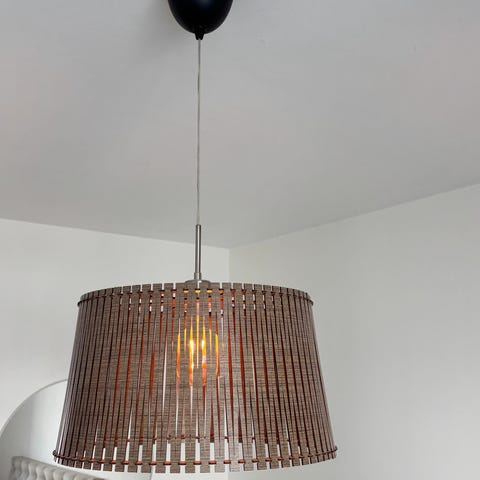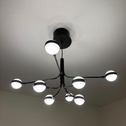 Säljer min taklampa (G9, max 5 W) med en total diameter på 46 cm i svart/vitt från Ellos. Lampan har sex glaskulor, varav varje kupa har en diameter på 10 cm. Höjden från taket är 32 cm.