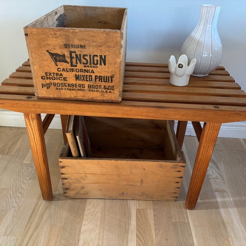 Stilren och tidlös bänk i massiv furu från 1970-talet. Den varma trätonen och den enkla designen gör den lätt att placera – perfekt i hallen, vid matbordet eller som avlastningsyta.