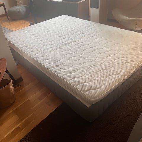 Säljer en IKEA Hemfjället kontinentalsäng i storlek 140x200 i ljusgrått tyg.
