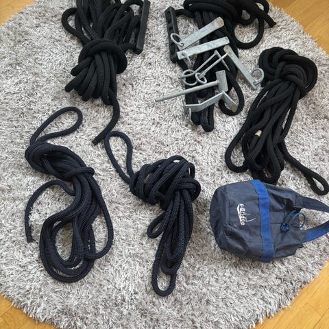 Förtöjningstampar i olika längder. Dimension 18 mm. C.a 10 st. Mellan 3 - 6 meters längder. Vissa helt oanvända. Med och utan gummifjäder. Flesta med kaus och schackel.