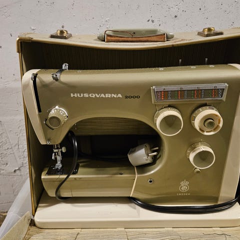 Husqvarna symaskin i grön färg med tillhörande väska. Maskinen är en äldre modell med mekaniska reglage på framsidan. Den står monterad i en hård väska/låda med tygklädd insida och har en separat fotpedal. Passar för grundläggande sömnadsarbeten i hemmet, som lagning och enklare sömnadsprojekt. Maskinen drivs med el och används tillsammans med vanliga symaskinstillbehör som nålar, tråd och spolar.