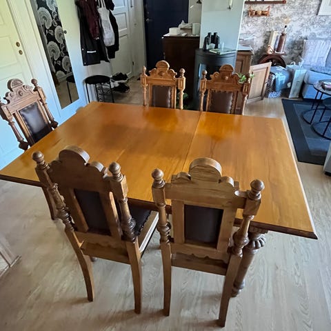Antikt matbord i trä brun med tillhörande stolar.