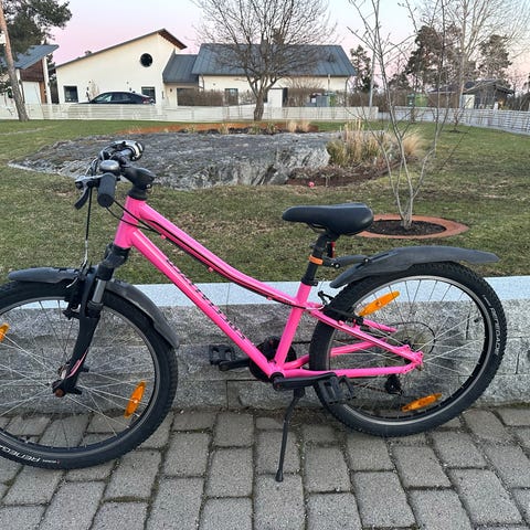 Mountainbike med 24" hjul lämplig för 8-12 åringar över 130cm. 8 växlad från Sram med Grip Shift växelhandtag. Hydrauliska skivbromsar från Tektro som biter mkt bra. Sparsamt använd med några mindre skrapmärken på bakre snabbkopplingen samt bromshandtagen men annars i mycket bra skick. Alltid förvarad inomhus. Väger strax över 10kg.