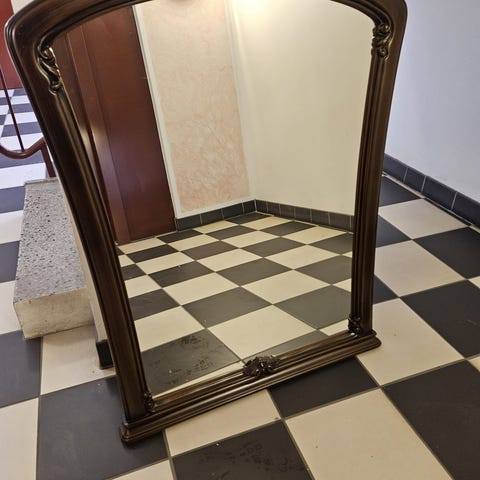 &Tradition spegel med mörk träram. Spegeln har en dekorativ, snidad ram i mörkt trä med klassiskt uttryck. Den är avsedd för placering mot vägg eller ovanpå möbel, till exempel byrå eller sideboard. Baksidan har upphängningsbeslag för montering på vägg. Passar i sovrum, hall eller vardagsrum som funktionell spegel och inredningsdetalj.