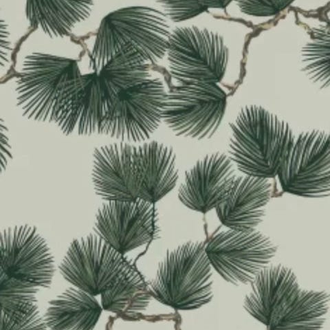 Tapeten Pine. Tallen är en symbol för ett långt liv. Livfullt men ändå fridfullt. Färgställningen Misty Blue kommer i en ljus dimblå färg på en beige bakgrund.