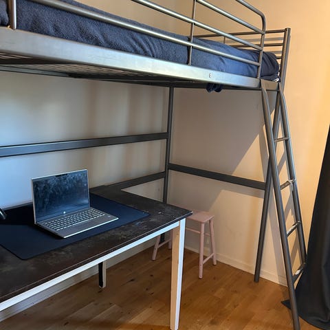 IKEA loftsäng med integrerat skrivbord i vit metall. Sängen är upphöjd med stege på sidan och har skyddsräcken runt liggytan. Under sängen finns ett fast skrivbord monterat mot stommen. Passar till exempel i mindre rum där man vill kombinera säng och arbetsplats. Madrass och övrig inredning på bilderna ingår inte om inget annat anges av säljaren.