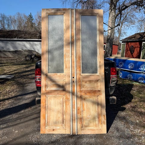 Pardörrar med glasrutor i vitmålat trä. Dörrarna består av tre dörrblad med spröjsade glaspartier upptill och fyllningar nedtill. Ungefärliga mått är 220 cm på höjden och 175 cm på bredden totalt.