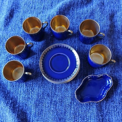 Setet består av små koppar med tillhörande assietter, dekorerade med guldfärgade detaljer på kant och öron.