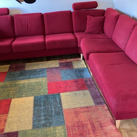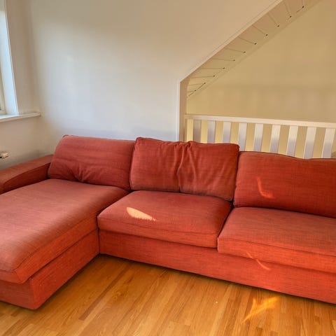 Soffan är i en varm röd/rost ton. Djupa sittplatser och mycket bekväm – perfekt för både vardag och mysiga kvällar - varje modul kan lyftas och har enormt mycket förvaring undertill :-)
