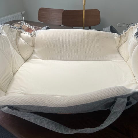 Babynest i vitt tyg. Mjuk, stoppad kant runtom och snörning i nederkant för att kunna justera öppningen. Passar som trygg och ombonad sovplats för spädbarn i säng, soffa eller vagn. Neutral färg som fungerar för alla kön.