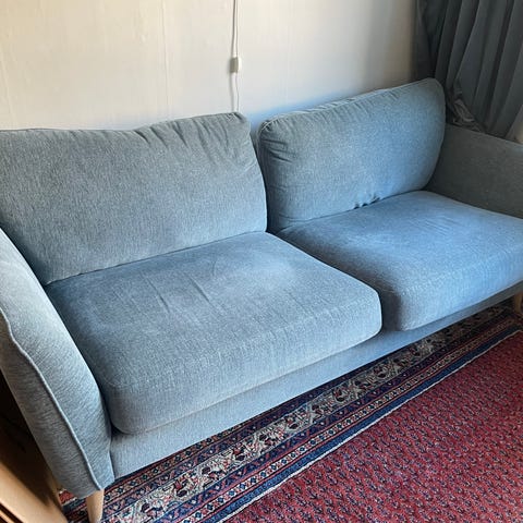 Soffa gråmelerad med löstagbara /vändbara dun plymoer. 205 cm. Ca 12 år men bra skick. Rökfri men vi har en norsk skogskatt (med tanke på allergier?)" mässinghjul på benen.