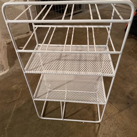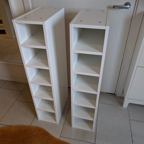 Bredd 55 djup 36 cm höjd ca 30 cm. Mörkare trä, består av två delar. Hyllorna står stabilt på varandra. Handtag på sidan så lätt att bära. Ger ett lyxigt intryck.