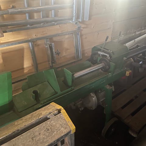Faxes ELH1000 vedklyv i blått utförande. Elektrisk vedklyv med liggande konstruktion monterad på stativ. Utrustad med klyvkniv och anhåll för vedträ, samt motor och styrning placerad på sidan av maskinen. Modellbeteckning ELH1000 enligt typskylt från Faxes Fabriks AB. Lämplig för klyvning av ved i hemmamiljö eller mindre verksamheter där man behöver effektiv mekanisk klyvning av vedträn.
