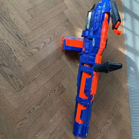 Nerf Mega leksaksvapen i röd plast. Batterifritt skumprojektilvapen avsett för lek med Nerf Mega-pilar (skumammunition). Har roterande trumma för flera skott och två handtag för stabilt grepp. Passar för inomhus- och utomhuslek för barn som använder Nerf-leksaker. Ej amo det stor på bild 5 vilket amo du behöver