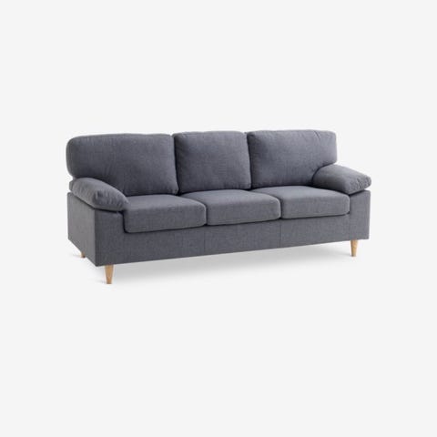 Soffan är grå med svarta ben.