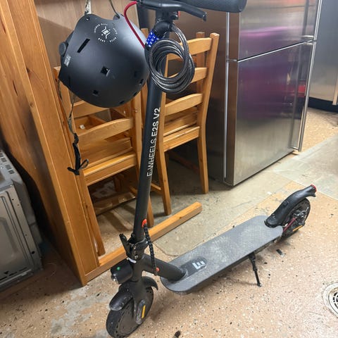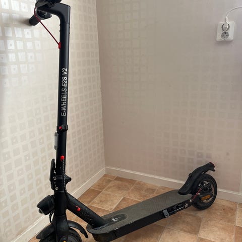 E-wheels E2S. Modellen har ståplatta, styre med handbroms och gasreglage samt stöd för parkering. Utrustad med fram- och bakbelysning samt reflexer på hjulen. Elsparkcykeln är hopfällbar för enklare förvaring och transport. Punkteringsfria däck.