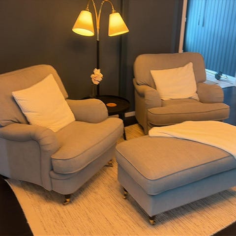 Fin fåtölj i Hampton-stil från Mio med matchande fotpall.