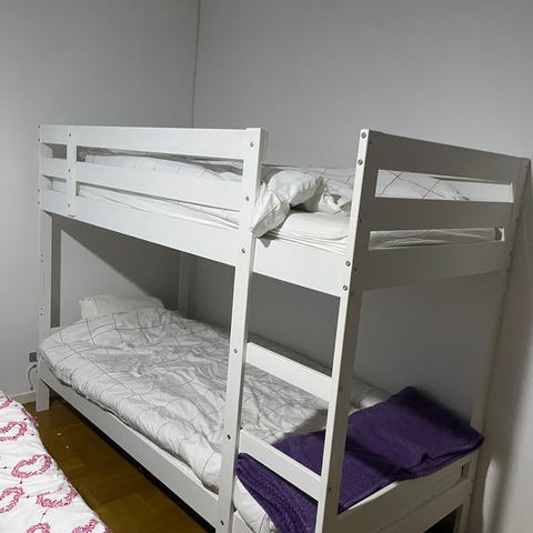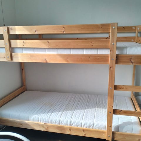 IKEA våningssäng i trä. Sängen består av två bäddar placerade ovanpå varandra med stabil träram. Passar för sovrum där man vill spara golvyta eller behöver extra sovplatser.