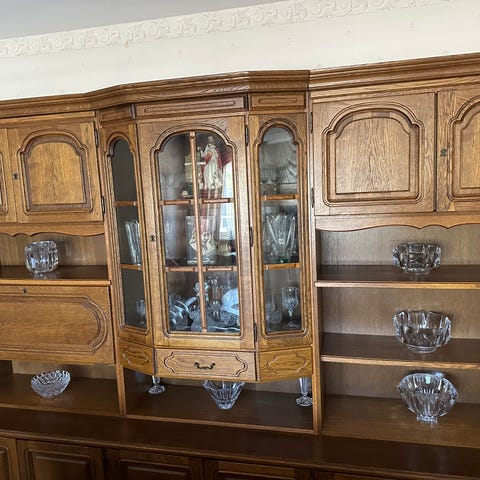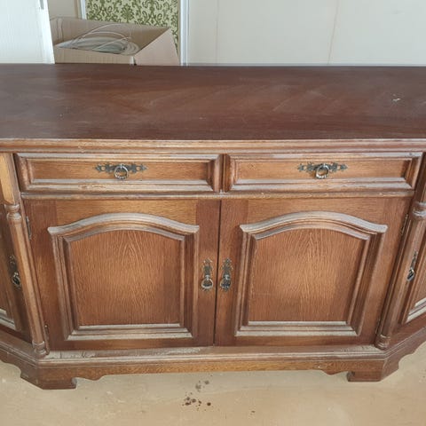 Skänk höjd 80 cm, bredd 183 cm, djup 44 cm där skänken är som bredast. Innehåller fyra lådor och fyra skåp. I mycket bra skick.