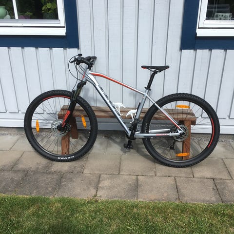 Mountainbike hardtail i blå färg med framgaffel med dämpning och hydrauliska skivbromsar fram och bak. Cykeln har grovmönstrade däck anpassade för terrängkörning och platta pedaler. Utrustad med rakt styre och sadelväska under sadeln för mindre tillbehör. Passar för cykling på grusvägar, stigar och vardagspendling på blandat underlag.