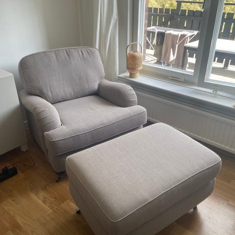 Fåtölj i grått tyg med stoppad sits och rygg. Modellen har lösa ryggkuddar och breda armstöd. Passar som sittplats i vardagsrum, sovrum eller läshörna.