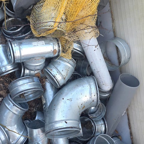 Ventilationskanaler och kopplingar, sannolikt tillverkade av galvaniserat stål. Rörböjar, T-kopplingar och raka skarvar.