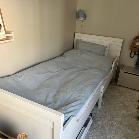 IKEA växasäng i vit. Modellen är utdragbar enligt måttskissen, vilket gör att längden kan justeras i flera steg. Passar barn som vuxit ur spjälsäng men ännu inte behöver fullstor säng. Madrass ingå. Vissa märken och skavanker finns på sängramen, se bilder för skick.