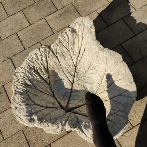 Stort djupt skålad rabarberfat med ett armeringsjärn under stick ner i marken.