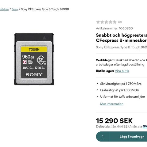 Säljer följande CF Express typ A minneskort: "Angelbird AV PRO 1Tb". Kortet är snabbare än vanliga SD-kort med sina 820 MB/s. Det har 1Tb minne.