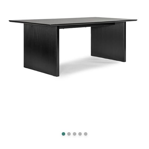 Mörkt matbord 200*100 med rundade kanter med 6 klädda Matstolar . Matbordet har plats för 8 personer .