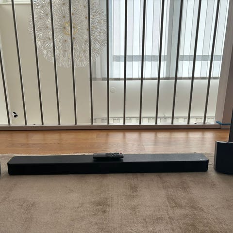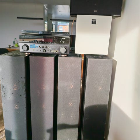 I perfekt skick surround högtalare med golvstativ väggfäste för soundbaren.