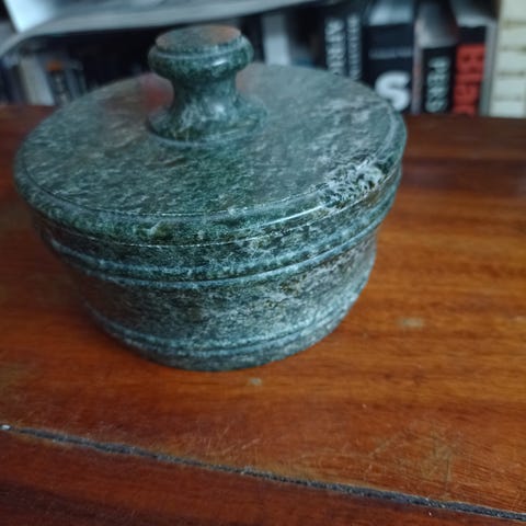 Smörask i Kolmårdsmarmor. Diameter cirka 11 cm. Höjd med knopp 8 cm. Väldigt fint allmänintryck. Mindre nagg/slitage. Men väldigt bra skick sett till ålder. Fin mörkare nyans. Finns i Östertälje/Södertälje. Se även min andra annons med snarlik smörask och andra föremål i Kolmårdsmarmor.