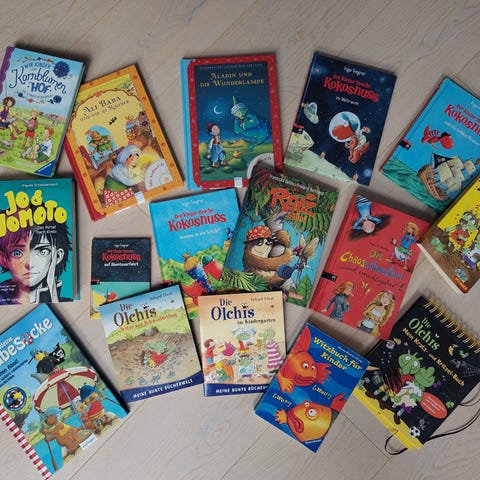 Disney samling med flera barnböcker och ljudböcker. På bilderna syns bland annat titlar som Djungelboken, Lejonkungen, Törnrosa, Trassel, Piff och Puff samt Bernard och Bianca. Blandningen består av inbundna böcker och cd-skivor med berättelser. Böckerna och skivorna är på svenska och riktar sig till barn. Samtliga titlar och utgåvor framgår av bilderna.