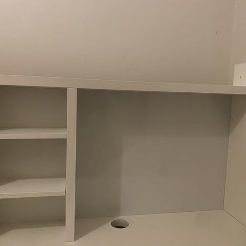 Skrivbordet har en bordsskiva med genomföring för kablar samt förvaring i form av ett skåp med hyllplan på ena sidan. Passar som arbetsplats eller pluggplats i barnrum. Mindre märken och repor förekommer på ytan enligt bilderna.
