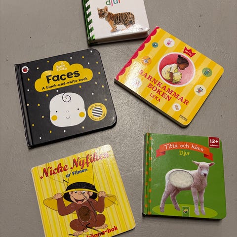 Pekböcker för barn med blandade titlar och motiv. Böckerna har hårda sidor anpassade för små barn och innehåller enkla texter och illustrationer. Passar för högläsning och tidig språkutveckling för yngre barn.