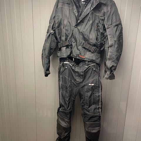 Motorcykelställ bestående av svart jacka och byxa med löstagbart quiltat innerfoder.