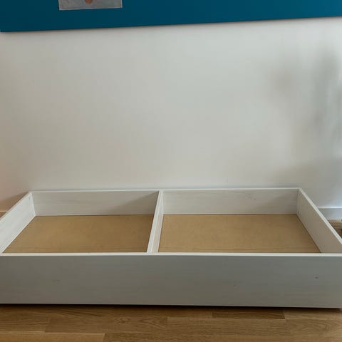 Sänglåda i vit färg. Lådan är avsedd att placeras under säng för extra förvaring. Tillverkad i träbaserat material med vit yta och undersida i skiva. Passar för förvaring av exempelvis sängkläder, kläder eller andra textilier under säng.