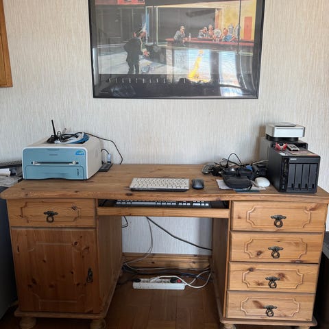 Superfint äldre skrivbord, rejält. Hyllor i ena skåpdelen och utdragbara fack i den andra, se bilder.