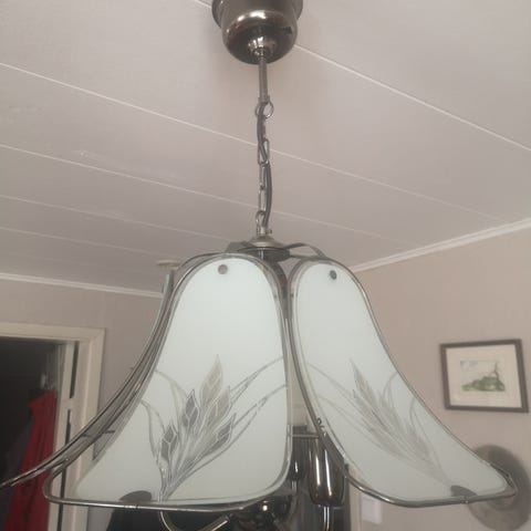 Taklampa med flera armar och skärmar i frostat glas samt stomme i metall. Lampan är avsedd för montering i tak och har flera ljuspunkter som ger spritt ljus i rummet. Passar exempelvis i vardagsrum, matsal eller sovrum. Standard takfäste och elkontakt för anslutning till befintlig elinstallation. Ljuskällor ingår inte, typ av sockel framgår vid närmare inspektion av lamphållarna.lampan är vridbar