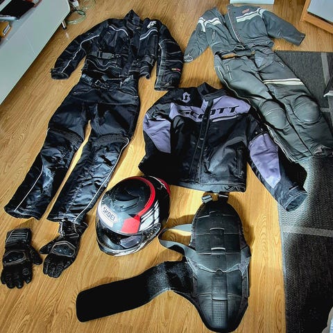 Ett BMW-ställ i goretex, dam strl 40 i gott skick. Diskret Bmw-märke på jacka och byxor, se bild. Helt och rent. Bmwkängor, hjälm, ryggsäck, regnställ, ny oanvänd airbagväst mm. Alla priser vid bilderna.