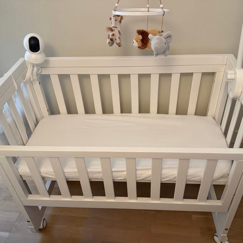 Vi köpte sängen med spjälskydd och madrass begagnade, medan madrasskydd och lakan köptes nya och är i princip oanvända då vår bebis hellre ville sova i vår säng.