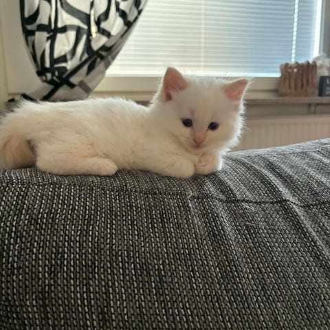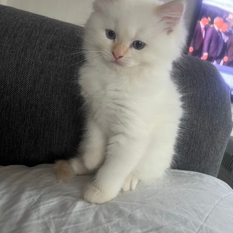 9 månader Han är snäll, älskar att leka och är tillgiven. jag letar efter familj till han på grund av jag ska flytta han fick 2 vaccin och han har bara en kvar. Pappan är en chinchilla och mamman är en blandat (ragdoll + skogskatt).