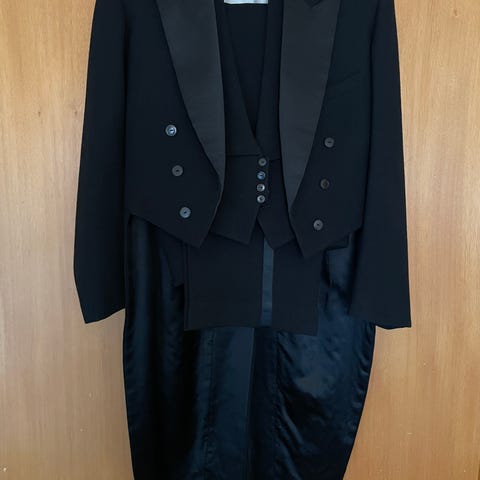 Frackrock: längd: 113cm, bröstomfång: 96cm (bärs oknäppt så större bröstomfång hos bäraren passar utmärkt), axelbredd: 47cm, ärmlängd: 64cm (kan tas ut minst 3cm). Nya täckta smokingknappar har lagts till av skräddare. Insydd för att passa mig som har storlek 48 på kostymjackor. Använd fyra gånger sedan kemtvätt.